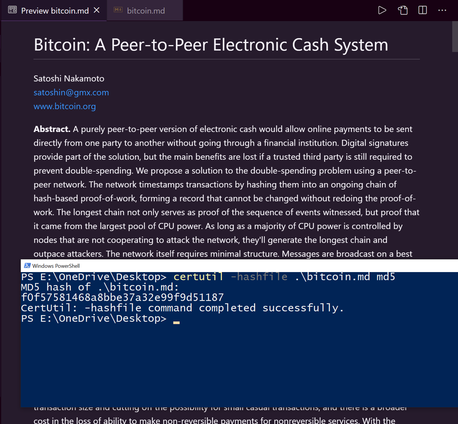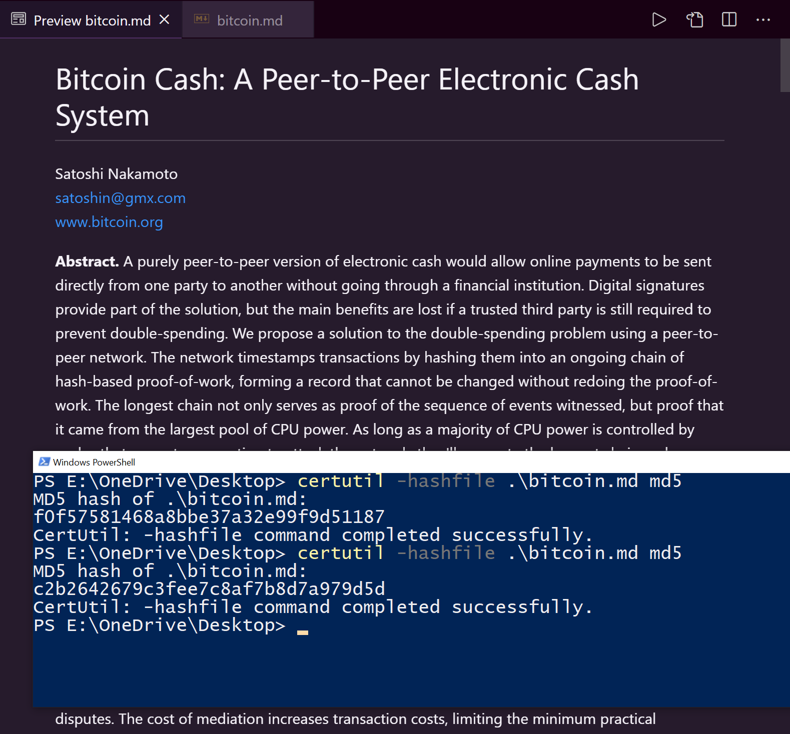 In the image on the left, you can see the checksum value created for the original, unedited file is ‘f0f5758146818bbe37a32e99f9d51187’. In the second image, a small defacement easily missed by many was made to the title, the word ‘Cash’ is added. This is the only change made to the whole file. Despite this, the checksum hash returned is radically different, outputting (the second output in the image on the right) ‘c2b2642679c3fee7c8af7b8d7a979d5d’. With the checksum being completely different, this makes for a quick and easy way to determine if files have been compromised or changed.