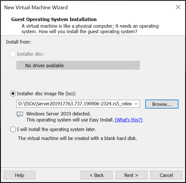 You’ll notice that VMWare detects the OS contained in the iso and displays ‘Easy Install’. The Easy Install feature will select some options automatically and optimise the VM for the OS we are installing, saving us some manual work during the install process. This feature isn’t available for all OS installs, however, odds are a majority of operating systems you find yourself using will support this feature, however.