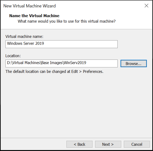 When you're asked about the install location, install it wherever you wish. If you're using VMWare Workstation Pro, I suggest creating a ‘Base Images’ file, or a location to save freshly installed machines, so you can quickly clone a new one fresh if you need a new machine quickly, to save the time-consuming process of installing from scratch every time.