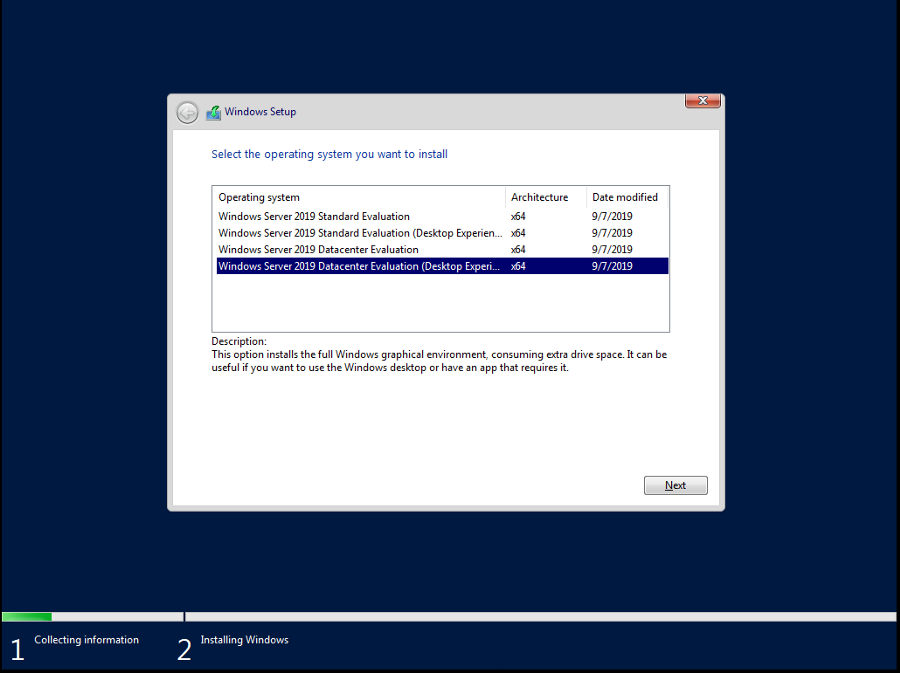 Moving on from this, we can now install the OS for real. Power on the VM and if prompted press any key. Next, select the appropriate language and region options for your usage, hit next, then install now. Next, you may be presented with a screen asking you to select a version of Server to install. Again, if you are unsure, select Datacenter, making sure to select the Desktop Experience option. If you don’t select Desktop Experience, you will install Server Core, which is GUI only and it not n00b friendly at all.